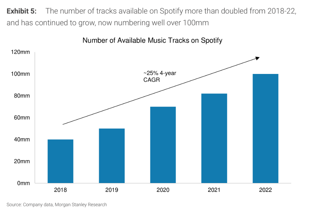 音乐领域同样如此,制作成本持续大幅下降。AI工具如ElevenLabs的Eleven Music可以直接从文本生成包含人声和乐器的完整歌曲。这直接导致了内容量的激增,Spotify平台上的曲目数量已远超1亿首。然而,这也带来了新的问题:音乐平台Deezer报告称,其每日收到的新曲目中近30%是完全由AI生成的,其中70%的播放行为被判定为旨在骗取版税的欺诈行为。