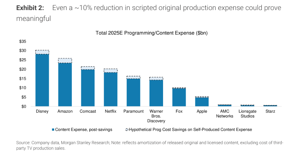 在成本效率方面,AI正成为制片厂削减开支的利器。报告预计,大型媒体公司有望将其整体节目制作费用降低约10%,其中原创剧本内容的制作成本(通常占总开支一半)有望实现10-30%的效率提升。具体的例子包括: